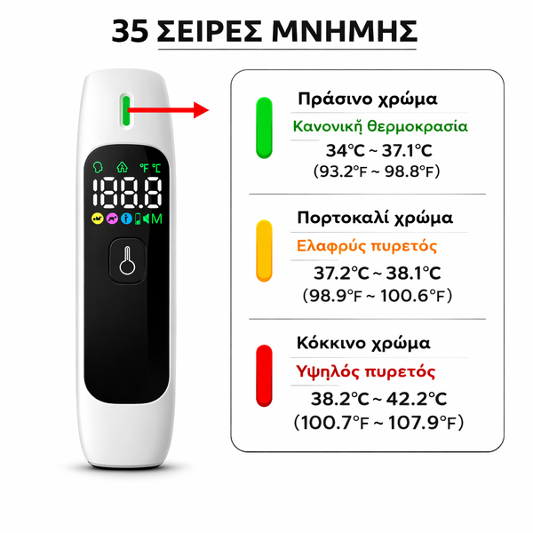 • Ένδειξη πυρετού με χρώματα (πράσινο / πορτοκαλί / κόκκινο)